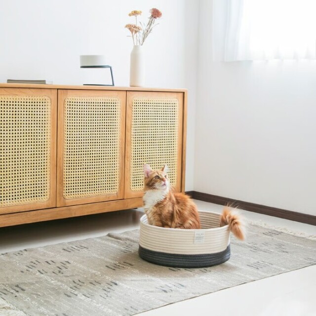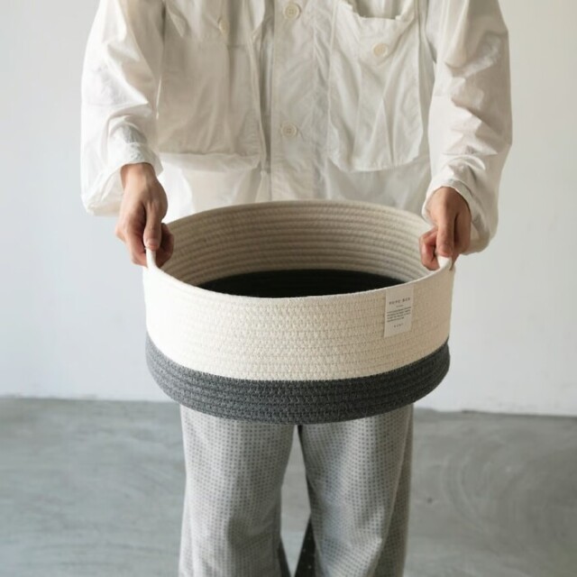 インテリアに馴染む2トーンカラーの丸型ロープベッド丸い形状が好きな猫の習性を活かした丸型形状のロープベッドで、