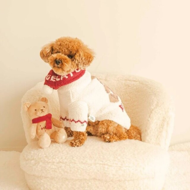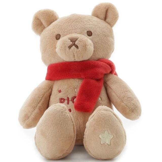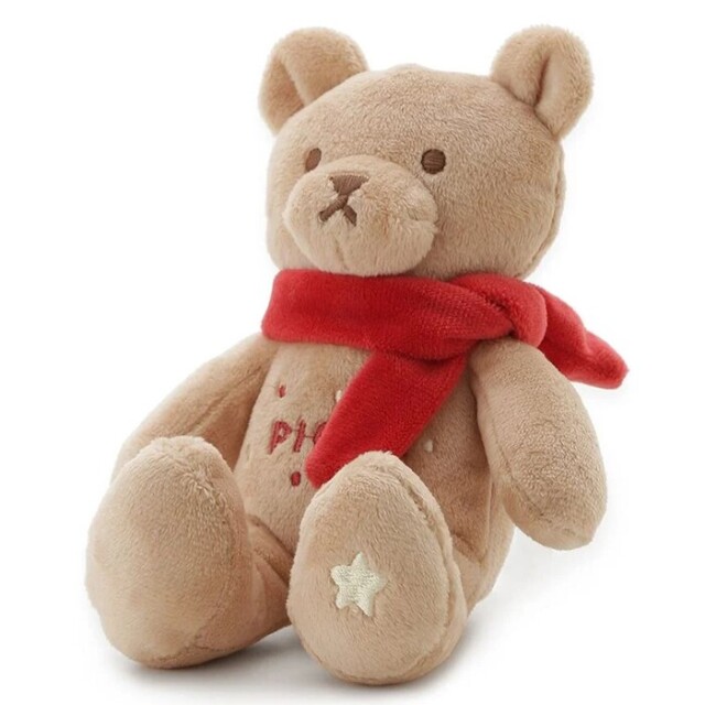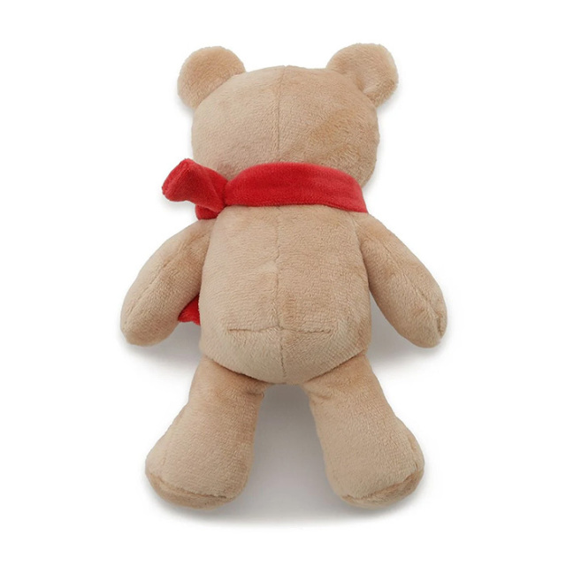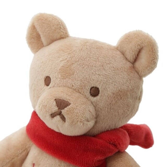 赤いマフラーを巻いた優しい表情のベアに癒される、ペット用のベア型トイです。