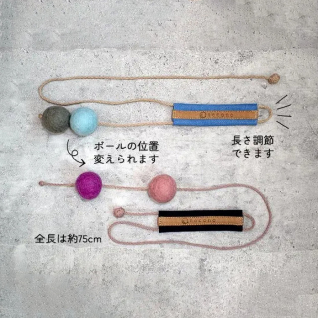 持ち手を持っていただき猫ちゃんと楽しく遊んだり、ドアノブや椅子などに持ち手上部の輪をかけて一人遊びもできます。