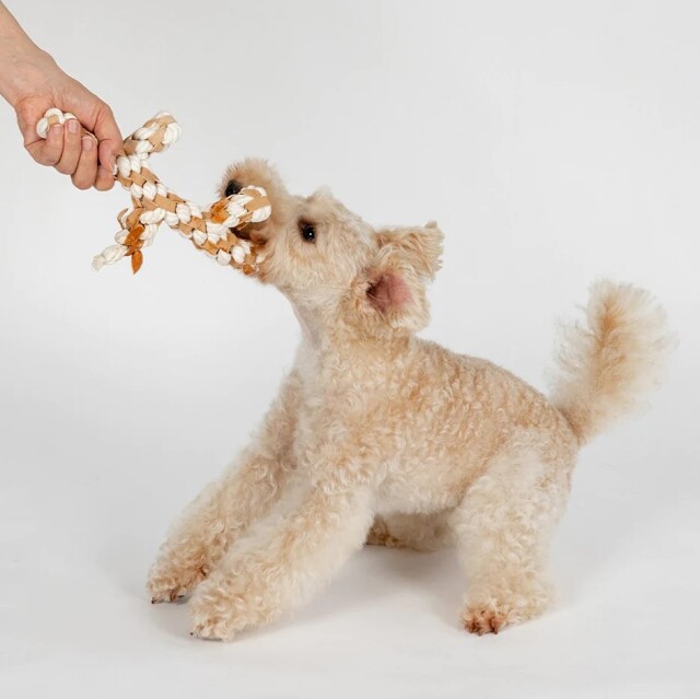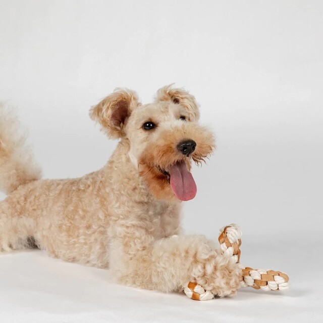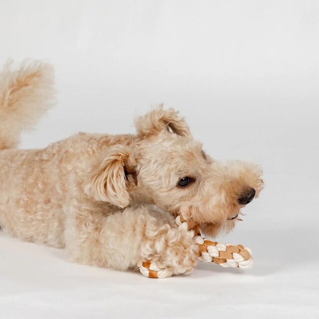 ペットと環境にやさしい製法、植物タンニンなめしで作られたレザーとコットンを編み込んだおもちゃです。