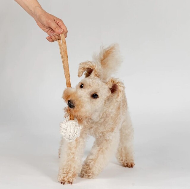 ペットと環境にやさしい製法、植物タンニンなめしで作られたレザーとコットンを編み込んだおもちゃです。