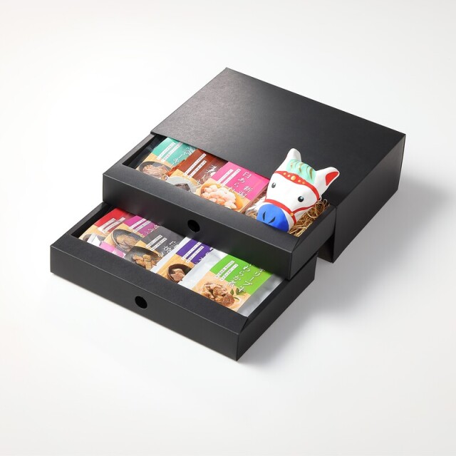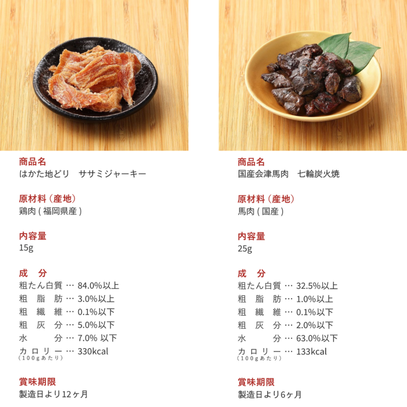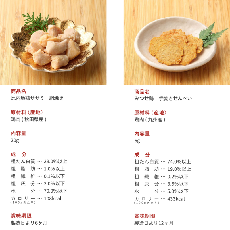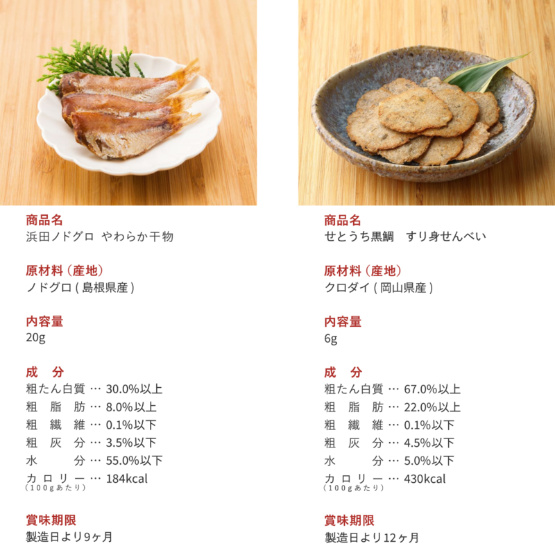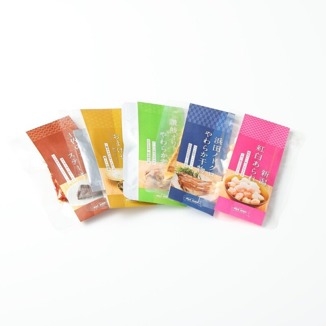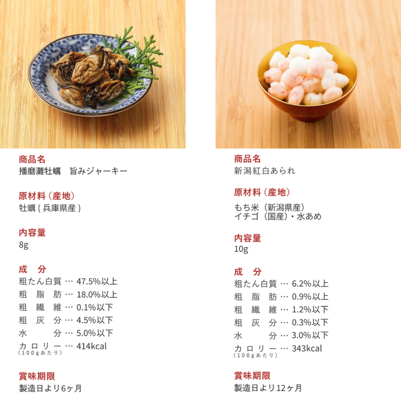 <みつせ鶏手焼きせんべい、はかた地鶏ササミジャーキー、せとうち黒鯛すり身せんべい、播磨灘牡蠣ジャーキー、新潟紅白あられ>