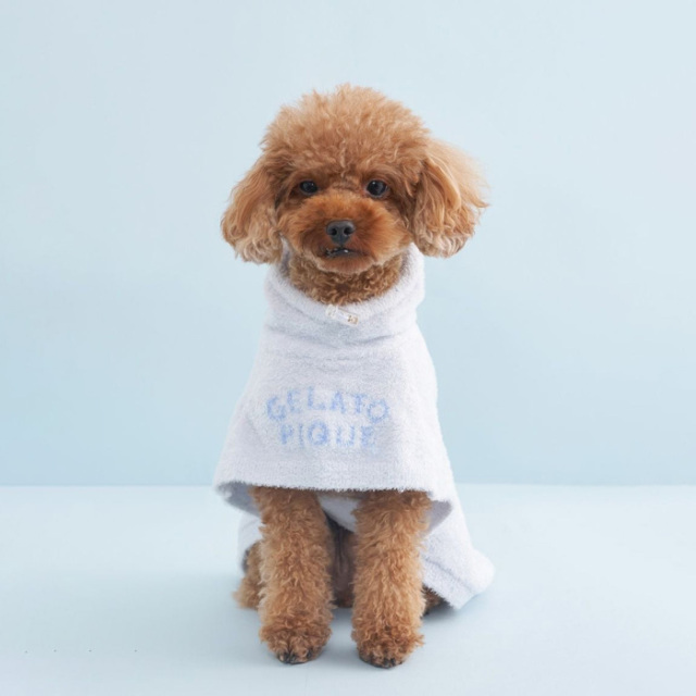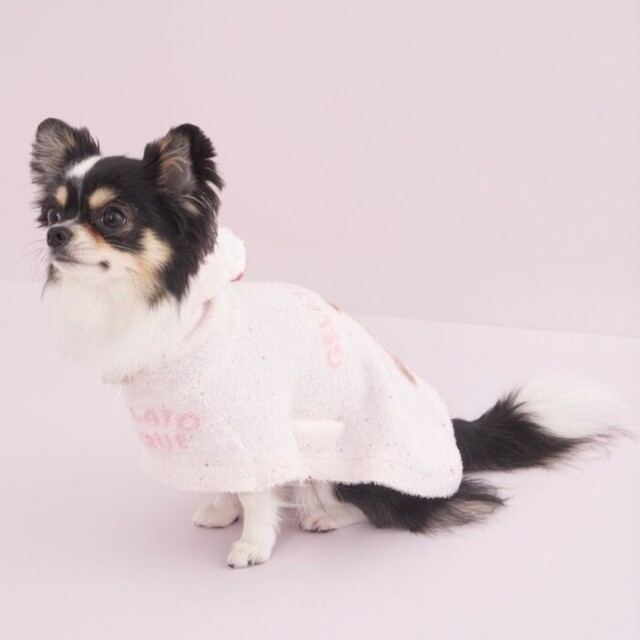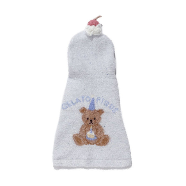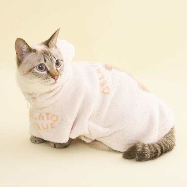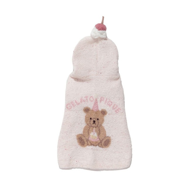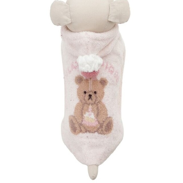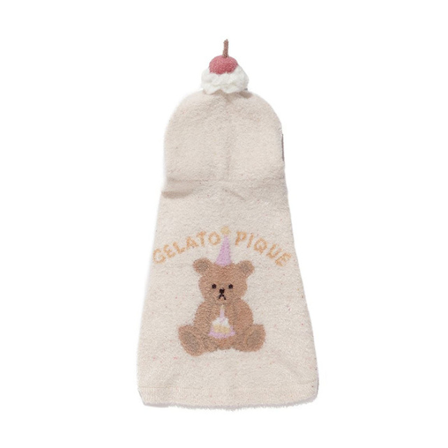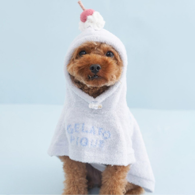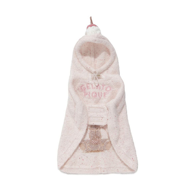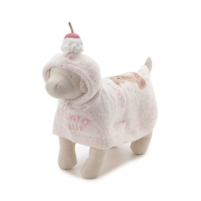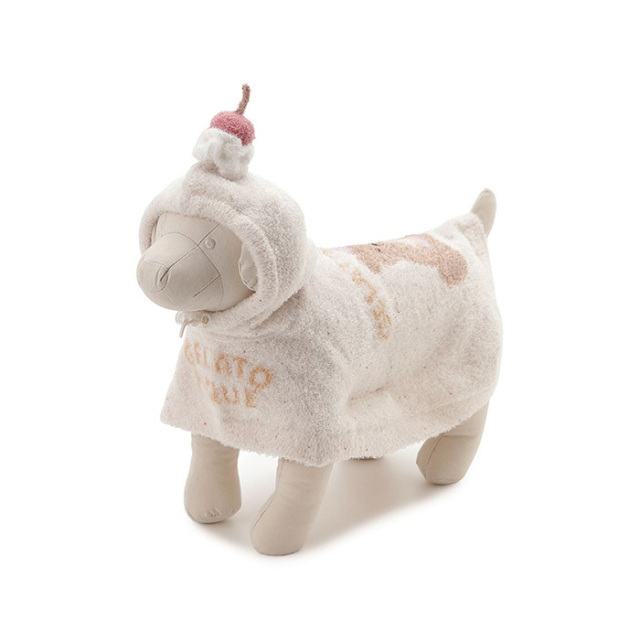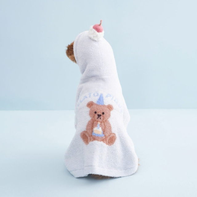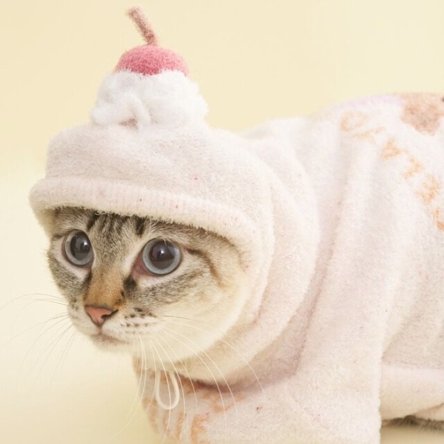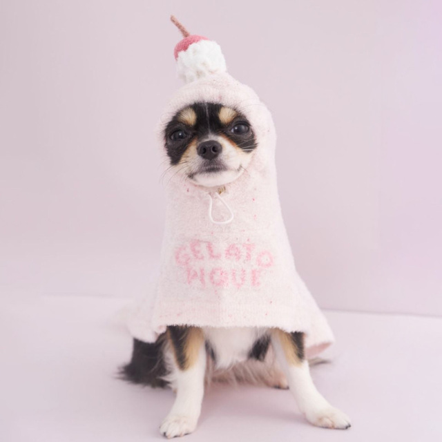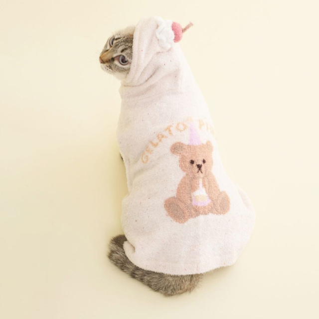 わんちゃん・ねこちゃんのお誕生日を祝う、HAPPYなムードいっぱいのバースデーシリーズです。なめらかな’スムーズィー’素材のニットを使用したケープは、クリームとチェリーが乗ったフードがポイント。
