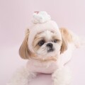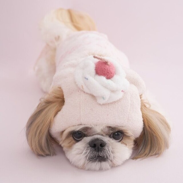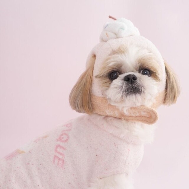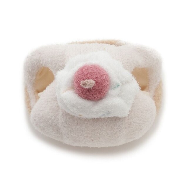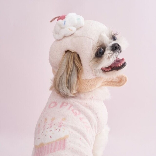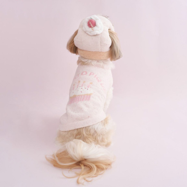 わんちゃん・ねこちゃんのお誕生日を祝う、HAPPYなムードいっぱいのバースデーシリーズです。ふんわりニットを使用した、カップケーキモチーフのユニークなハット。