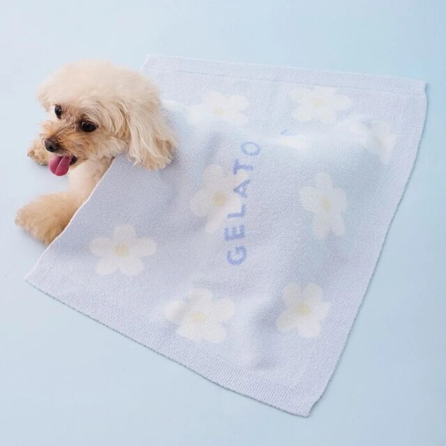 猫ちゃんや小型犬にちょうど良いサイズ感で仕上げた、お花とロゴジャガードがキャッチーなブランケットです。もちもちとした肌触りの’スムーズィー’で、お昼寝や寛ぎタイムをより快適に。