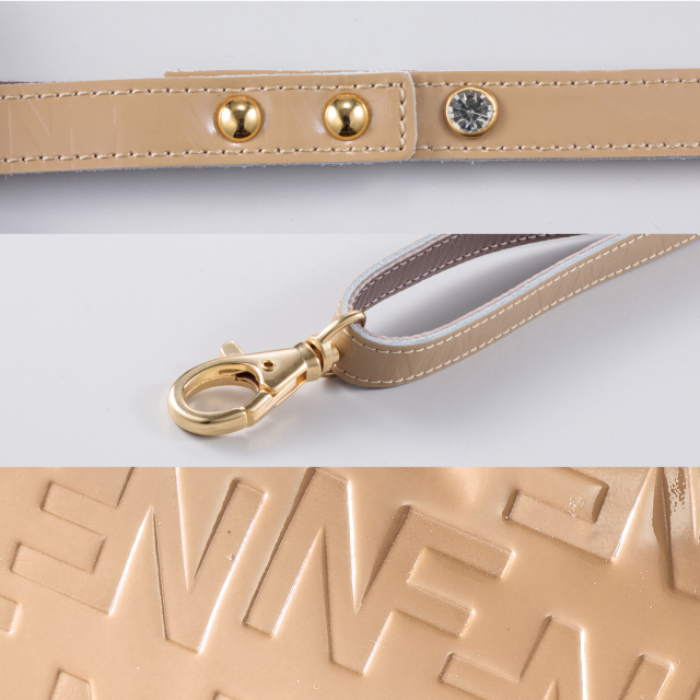 ロゴを全体にあしらった高級感のある型押しレザー ジュエリーカシメとゴールド金具がアクセント。