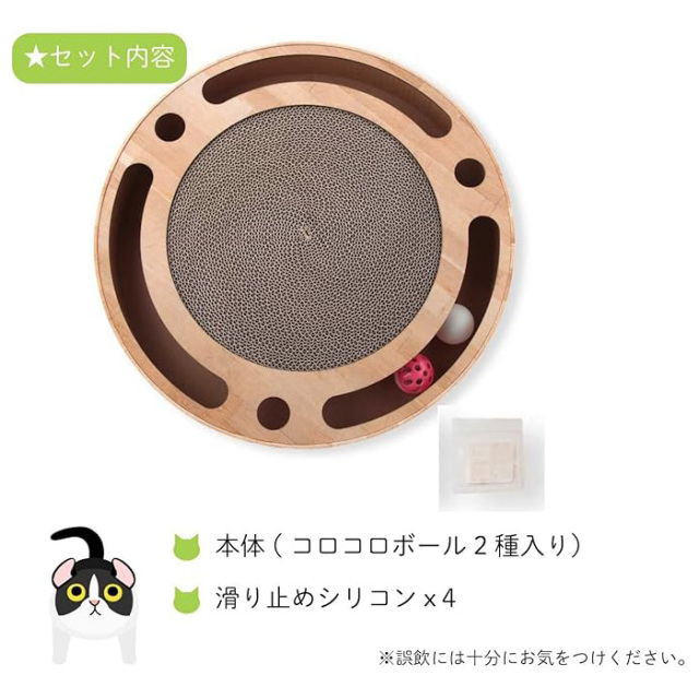 【原材料】爪とぎ:ダンボール、白色ボール:ABS樹脂、鈴入りボール:ポリスチレン樹脂