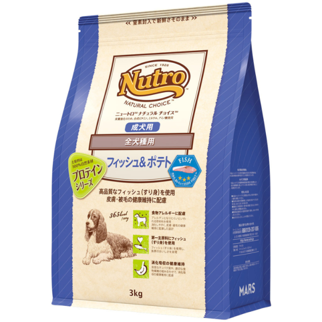 フィッシュは、DHAなどのオメガ3脂肪酸を豊富に含む良質な自然素材です。プロテイン シリーズのフィッシュ&ポテト製品は、高品質なフィッシュ(すり身)を第一主原料に使用し、抜群のおいしさを実現しました。
