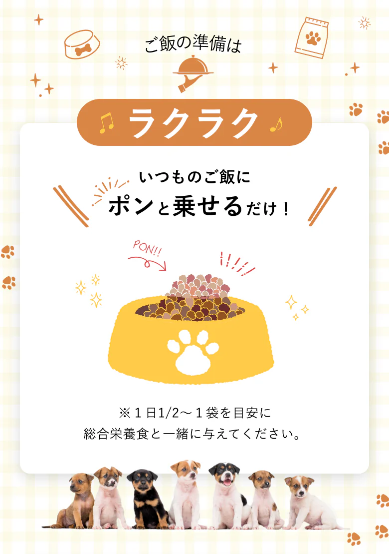 1日1/2〜1袋を目安に総合栄養食と一緒に与えてください。