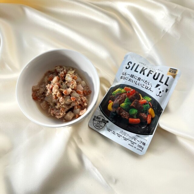 【原材料】牛肉、じゃがいも、にんじん、さつまいも、トマト、ブロッコリー、なたね油、カラダシルク