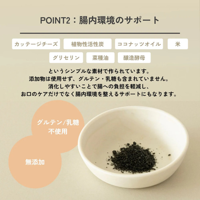 ベストセラーのデンタルフレークに植物性活性炭をプラスし、デンタルケアと腸内環境の維持、さらに腎臓の健康にも配慮した特別なフレークです。