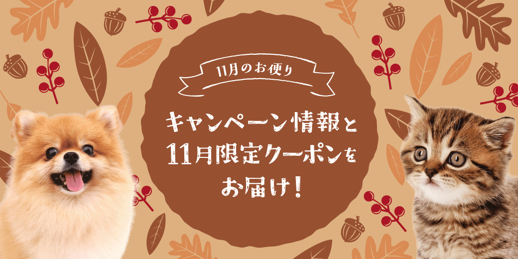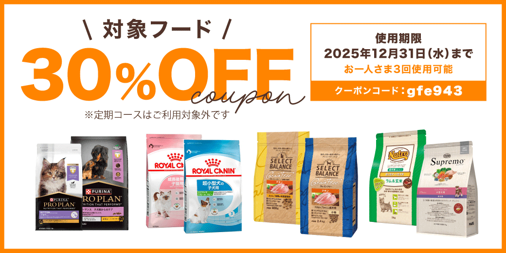 TOP 特設ページ 2025年11月のインフォメーション 特設ページ 2025年11月のインフォメーション いつも ペッツファーストオンラインストア をご利用いただき誠にありがとうございます。今月もキャンペーンや新商品が盛りだくさん♪ぜひ最後までご覧ください。 🍂今月のキャンペーン🍂 \🐶ワンワンワンの日!🐶/ 🍴オリジナルウェットフードプレゼントキャンペーン🍽️ 11/1(土)~11/11(火)まで 対象のドライフードまたはウェットフードご購入でペッツファーストオリジナルワンちゃん用ウェットフード3種(ポーク・チキン・フィッシュ)を1袋ずつ同梱プレゼント🎁 対象のドライフードはこちら 対象のウェットフードはこちら \ ベッド・ブランケット特集 /ワンちゃん・ネコちゃんの快適な睡眠をサポートするベッド・ブランケットを集めました🛏朝晩の冷えが気になる今にぴったりです。今ならポイント3倍です♪ ベッド・ブランケット特集はこちら その他、 ● 各種タイムセール● 毎月12日のわんにゃんの日 ● 毎月29日の肉球の日 など!楽しみにお待ちください♪ 🍂今月のおすすめ商品🍂 ■Petifam ふわふわマカロンベッド ファスナー付き S まるごと洗えて清潔。優しいくすみカラーで人気のふわふわベッド。2か所にチャックが付いていて全ての中綿が取り外し可能!カバーと別々になるのでお洗濯も簡単です♪ ■【ペッツファーストオリジナル】ブランケット(ロゴ入り) ペッツファーストオリジナルブランケットです。フリース素材のもこもこブランケットは、膝の上にのせるときや抱っこの時にも大活躍。包まれることでワンちゃんネコちゃんが安心して過ごせます♪ ■オーガニックアルガンオイル肉球クリーム オイルの中でも高級な『アルガンオイル』をたっぷり使った肉球クリーム。・肉球クリームにアルガンオイル約40%配合!・無香料なのでにおいが気にならない!・舐めても問題ない天然成分100%!アルガンオイルに含まれるビタミンE成分が肉球をもっちりとみずみずしく整え、蜜蝋がオイルをゆっくり浸透させるので生き生きとした肉球を保ち乾燥から守ります。乾燥が気になり始めるこの時期にぴったりの商品です。 新商品も続々入荷中! サイトにてぜひチェックしてください★ 新商品はこちら 🍂今月のスペシャルクーポン🍂 【全品対象】11月限定! お一人さま2回までご利用いただけるお得なクーポンをプレゼント!クーポンコード【GAM834】 ※税込8,000円以上のお買い物にご利用いただけます。※定期コースにはご利用いただけませんのでご注意ください。 対象フード30%OFFクーポン お一人さま3回までご利用可能!対象フードは「ピュリナプロプラン」「ロイヤルカナン」「セレクトバランス」「ニュートロ」です。 ※定期コースにはご利用いただけませんのでご注意ください。 クーポンコード【gfe943】 クーポンのご利用方法1.会員ログイン2.カート画面でクーポンコードを入力3.クーポンコード入力後に「クーポンを適用する」を押していただくと、割引が適用されます※定期コースはご利用対象外ですのでご了承ください 今後もより一層、皆さまに質の高いペットライフを 提供できるよう尽力してまいりますので、よろしくお願いいたします。 特設ページ