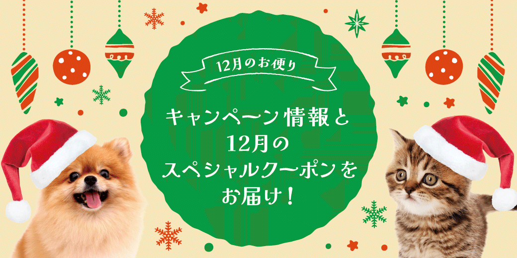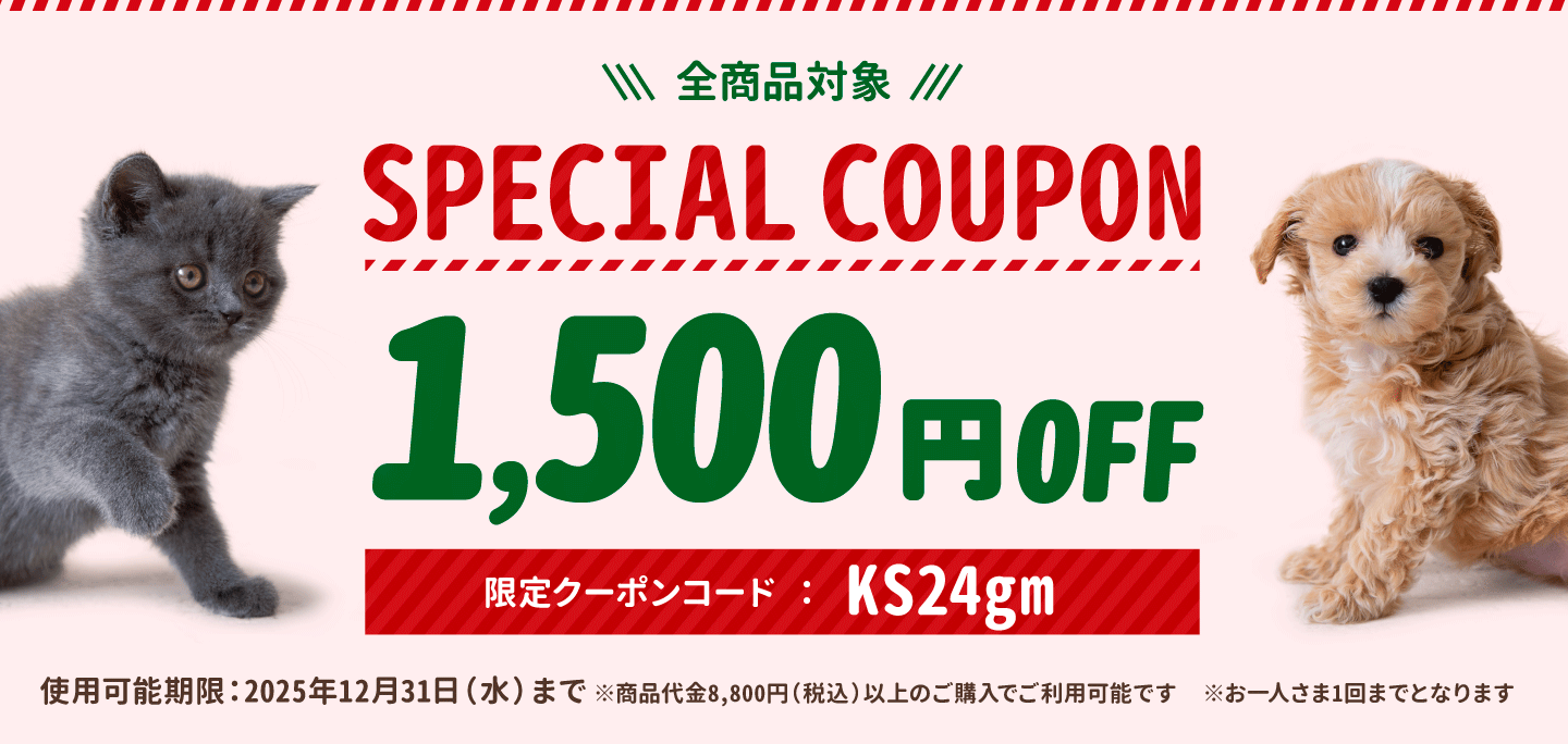 TOP 特設ページ 2025年12月のインフォメーション 特設ページ 2025年12月のインフォメーション いつも ペッツファーストオンラインストア を ご利用いただき誠にありがとうございます。 今月もキャンペーンや新商品が盛りだくさん♪ ぜひ最後までご覧ください。 ✨🎄今月のキャンペーン🎄✨ \🎅🏻2025クリスマスキャンペーン🎄/ 12月25日(木)まで! 対象のクリスマス商品をご購入で 【ジェリーベアおもちゃ】を同梱プレゼント🎁 楽しいピーピー音入り&小さなペットでもくわえやすいサイズ感⭐ ワンちゃん・ネコちゃんとの特別な思い出づくりに ぜひご利用ください🧸 \❄Winterフェア開催⛄/対象商品がポイント3倍! あったかグッズやほっこりスープ、 もこもこお洋服など…冬を楽しくする商品が勢ぞろい🎵 その他、 ● 各種タイムセール ● 毎月12日のわんにゃんの日 ● 毎月29日の肉球の日 など… 楽しみにお待ちください♪ ✨🎄今月のおすすめ商品🎄✨ ■星のちーず(犬猫用おやつ) 小さくて可愛い星の形をしたチーズのおやつです。ワンちゃん・ネコちゃんの食いつきも抜群で、 しつけやトレーニングのご褒美としてはもちろん、いつものごはんへのトッピングにもぴったり♪クリスマスの特別な気分を盛り上げてくれる、見た目にも楽しいおやつです。 ■ソルグラ クリスマスおもちゃ かわいくてユニークなデザインのクリスマスおもちゃ!種類はツリー、サンタ、キャンディ、ジンジャーぼうやの4種類。カシャカシャと、ピーピー音で、クリスマス気分をさらに盛り上げてくれます♪プレゼントにもおすすめのアイテムです。 ■gelato pique トナカイケープ イベントでぜひ着せてあげたい、もこもこのトナカイモチーフのニットケープです。フード部分にトナカイの顔やツノを付け、背中にロゴジャガードをあしらいました。面ファスナー付きのベルトで留めるだけなので、肌寒い日のお散歩や、写真撮影の際などにもさっと着せることが可能です。 新商品も続々入荷中! サイトにてぜひチェックしてください★ 🌟新商品はこちら🌟 ✨🎄今月のクーポン🎄✨ 【全品対象】12月限定! ✨12月のクーポンは 1500円OFF✨ お一人さま一回までご利用いただけます。 クーポンコード:KS24gm 対象フード30%OFFクーポン お一人さま3回までご利用可能!対象フードは「ピュリナプロプラン」「ロイヤルカナン」「セレクトバランス」「ニュートロ」です。 クーポンコード:gfe943※定期コースにはご利用いただけませんのでご注意ください。 クーポンのご利用方法 1.会員ログイン2.カート画面でクーポンコードを入力 3.クーポンコード入力後に「クーポンを適用する」を押していただくと、割引が適用されます※定期コースはご利用対象外ですのでご了承ください 2025年もご愛顧いただき誠にありがとうございました。 寒い冬は免疫力が低下しがちなので、 しっかりと寒さ対策をしてよい年末年始をお過ごしくださいませ。 ペッツファースト一同、皆様とペットたちのご健康とご多幸を心からお祈りいたします。 2026年も、皆さまに質の高いペットライフを 提供できるよう尽力してまいりますので、よろしくお願いいたします。 特設ページ