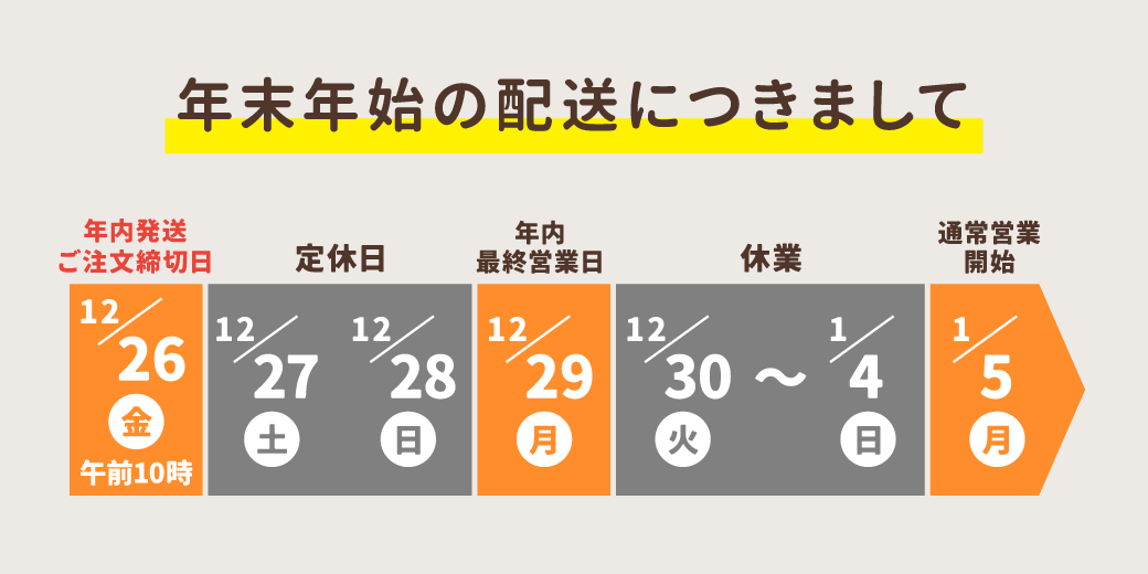 お届け予定日が【1月3日(土)】までのお客様は年内中に発送となります。